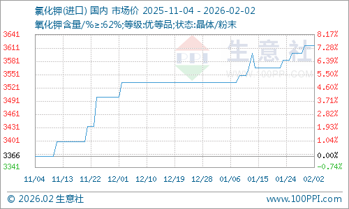 近期国内氯化钾市场价格总体呈现高位趋稳态势,波动幅度有限。2月2日,生意社氯化钾(进口)基准价为3616.67元/吨,与本月初持平。