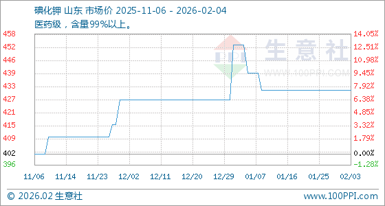 2月4日,生意社碘化钾基准价为432.00元/公斤,与本月初持平。