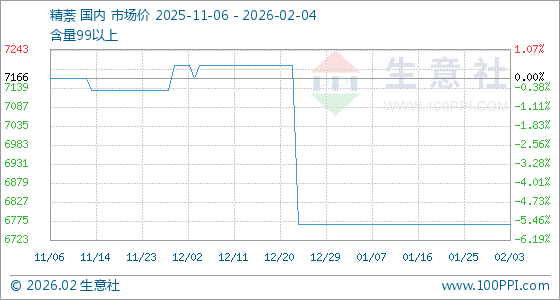 2月4日,生意社精萘基准价为6766.67元/吨,与本月初持平。