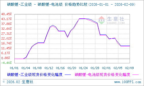 据生意社商品行情分析系统显示:近期碳酸锂价格高位下跌,截至2月9日,生意社电池级碳酸锂基准价136000元/吨,较上周同期(2月2日)下跌6.21%,环比下跌2.86%,同比上涨71.7%。