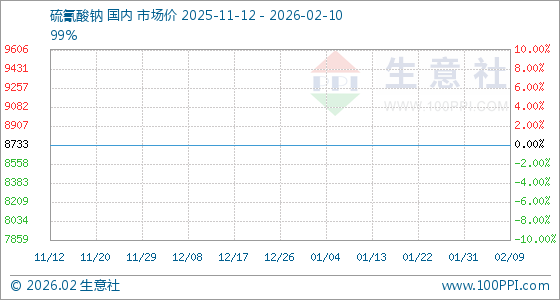 2月10日,生意社硫氰酸钠基准价为8733.33元/吨,与本月初持平。