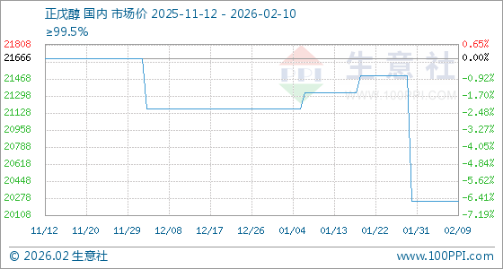 2月10日,生意社正戊醇基准价为20250.00元/吨,与本月初持平。