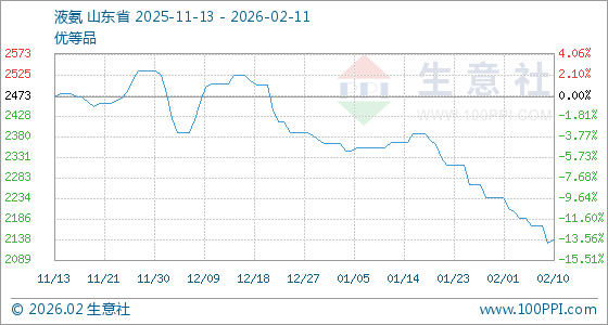 2月11日,生意社液氨基准价为2136.67元/吨,与本月初(2236.67元/吨)相比,下降了4.47%。