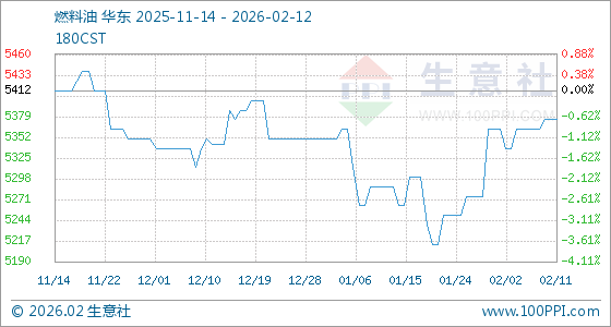 2月12日,生意社燃料油基准价为5375.00元/吨,与本月初(5362.50元/吨)相比,上涨了0.23%。