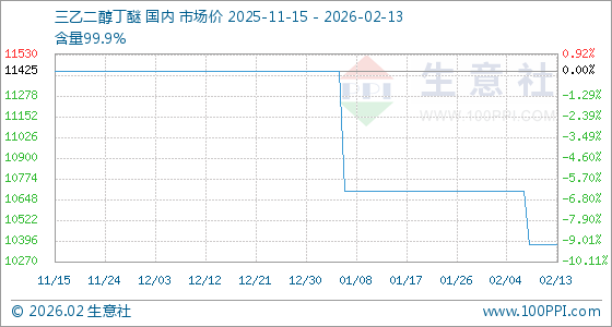 2月13日,生意社三乙二醇丁醚基准价为10375.00元/吨,与本月初(10700.00元/吨)相比,下降了3.04%。