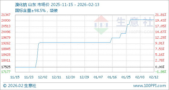 2月13日,生意社溴化钠基准价为21000.00元/吨,与本月初持平。