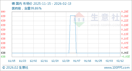 2月13日,生意社碘基准价为638.33元/千克,与本月初持平。