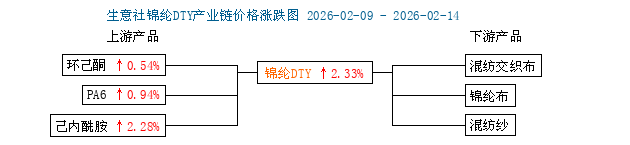 本周锦(2026年2月9日-2月14日)纶长丝成本端支撑力度较强,核心原料己内酰胺及相关产业链产品走势坚挺,直接推动锦纶长丝生产成本上行,成为本周市场价格上调的核心驱动力之一。