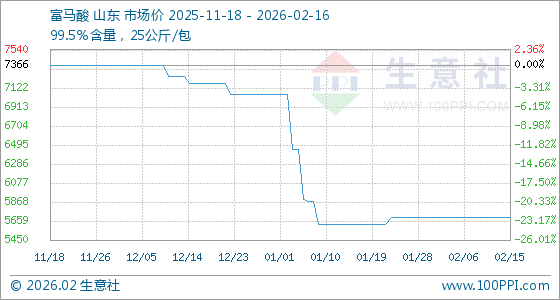 2月16日,生意社富马酸基准价为5700.00元/吨,与本月初持平。