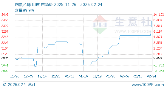2月24日,生意社四氯乙烯基准价为3261.11元/吨,与本月初(3188.89元/吨)相比,上涨了2.26%。