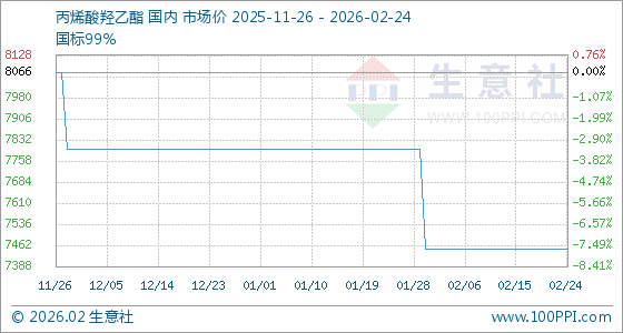 2月24日,生意社丙烯酸羟乙酯基准价为7450.00元/吨,与本月初持平。
