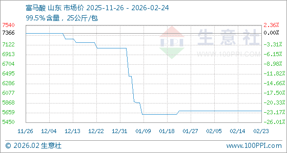 2月24日,生意社富马酸基准价为5700.00元/吨,与本月初持平。