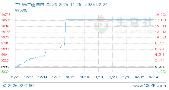 2月24日,生意社二甲基二硫基准价为10566.67元/吨,与本月初持平。