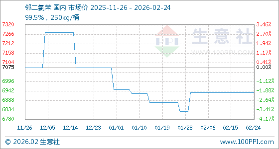 2月24日,生意社邻二氯苯基准价为6933.33元/吨,与本月初持平。