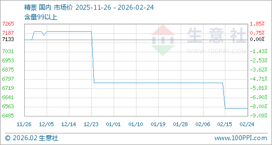 2月24日,生意社精萘基准价为6550.00元/吨,与本月初(6766.67元/吨)相比,下降了3.2%。