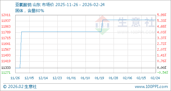 2月24日,生意社亚氯酸钠基准价为11950.00元/吨,与本月初持平。
