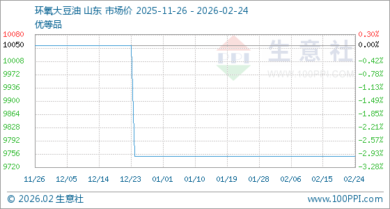 2月24日,生意社环氧大豆油基准价为9750.00元/吨,与本月初持平。
