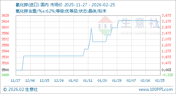2月25日生意社氯化钾(进口)基准价为3600.00元/吨