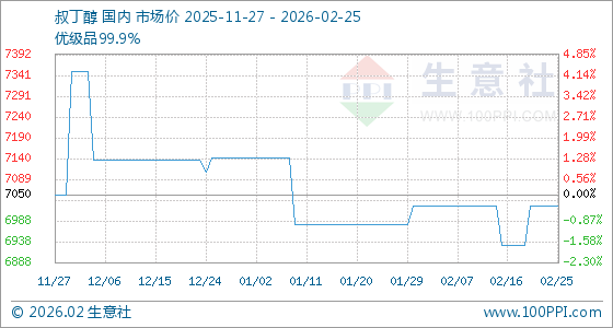 2月25日,生意社叔丁醇基准价为7025.00元/吨,与本月初持平。