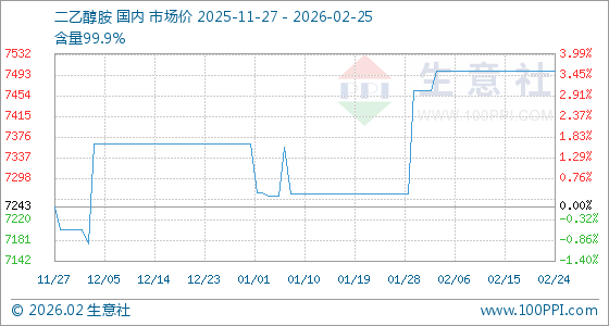 2月25日,生意社二乙醇胺基准价为7500.00元/吨,与本月初(7464.29元/吨)相比,上涨了0.48%。