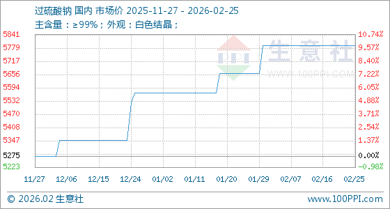 2月25日,生意社过硫酸钠基准价为5790.00元/吨,与本月初持平。