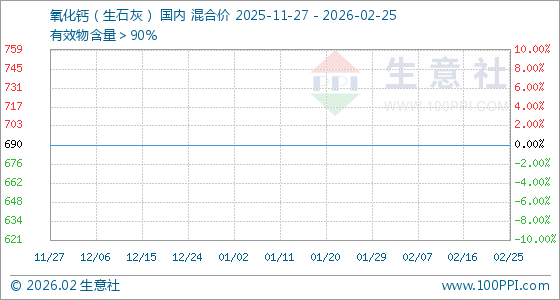 2月25日,生意社氧化钙(生石灰)基准价为690.00元/吨,与本月初持平。
