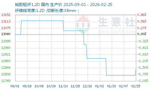 据生意社商品行情分析系统监测,2026年2月25日,粘胶短纤市场均价为12840元/吨,较上一工作日价格上涨40元/吨。